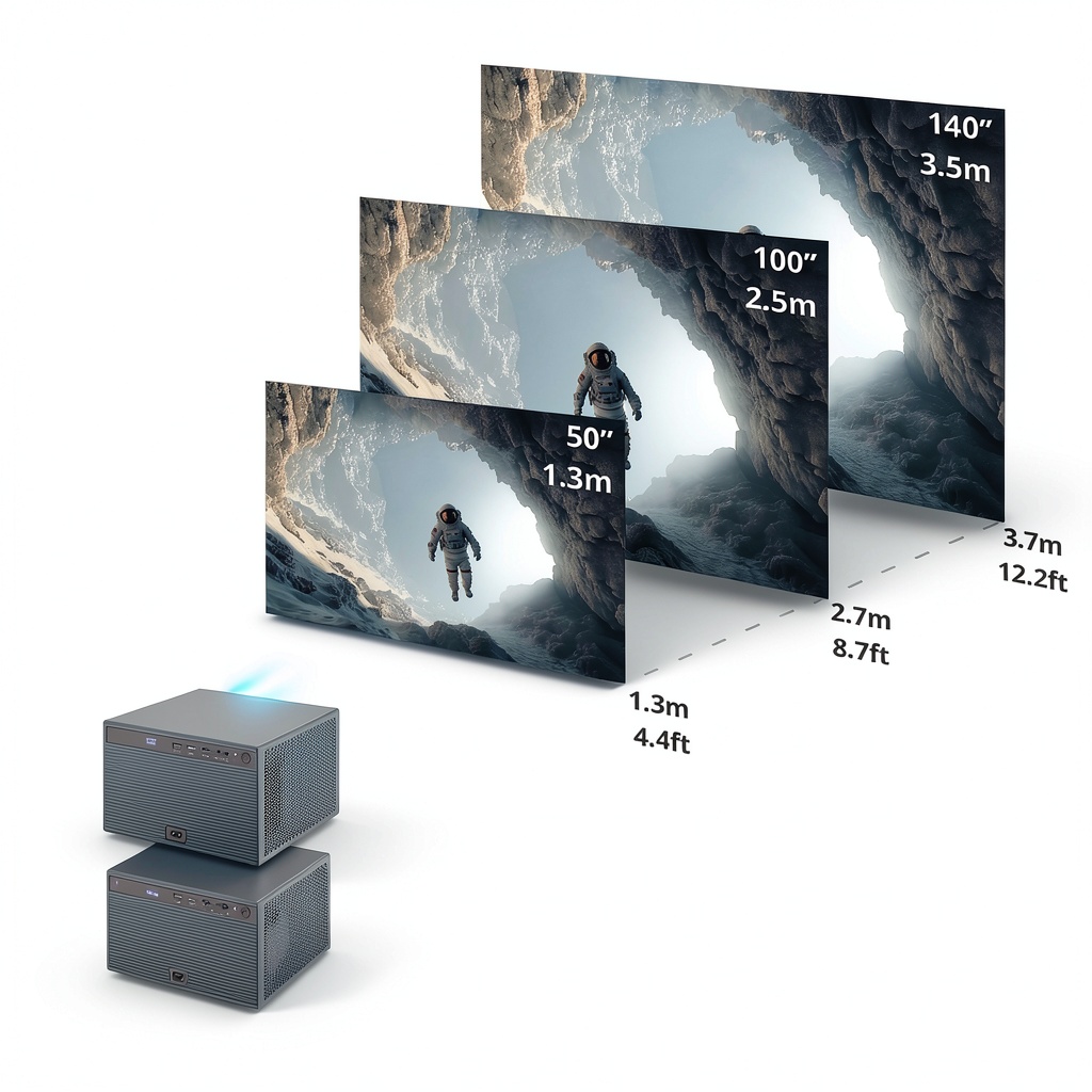 This projector can display screen sizes from 50 to 140 inches, with a 100-inch image achievable from approximately 8.7 feet away.