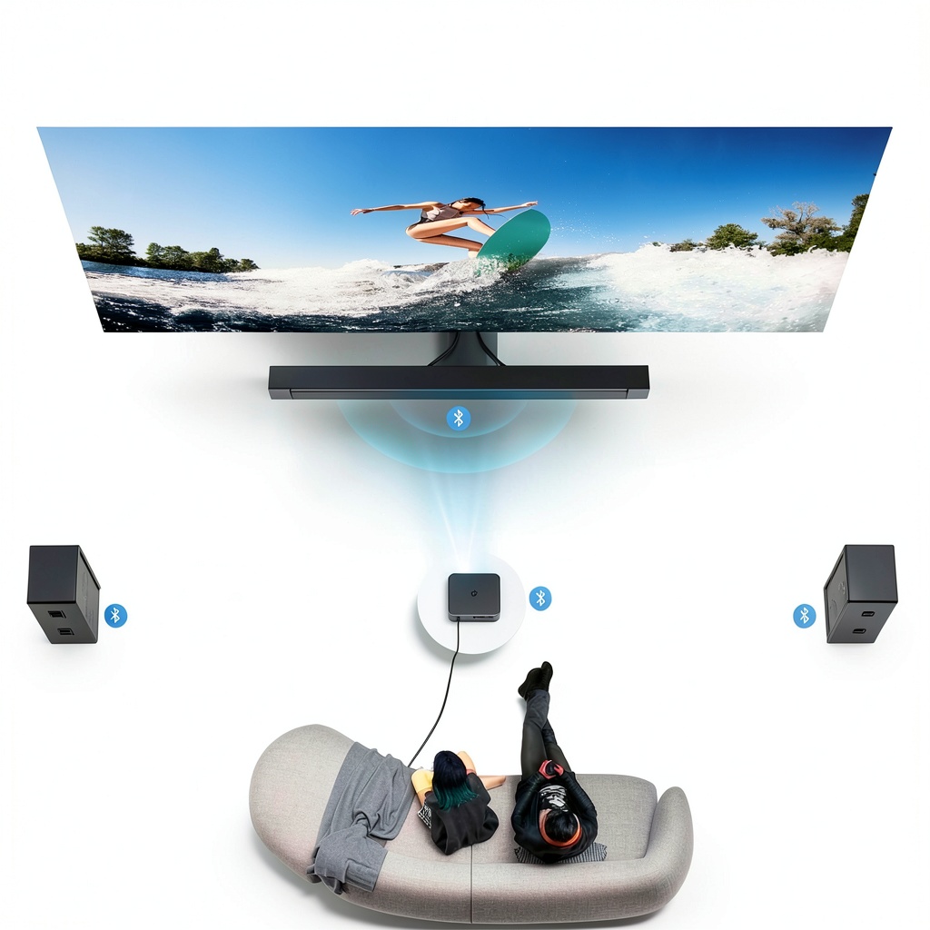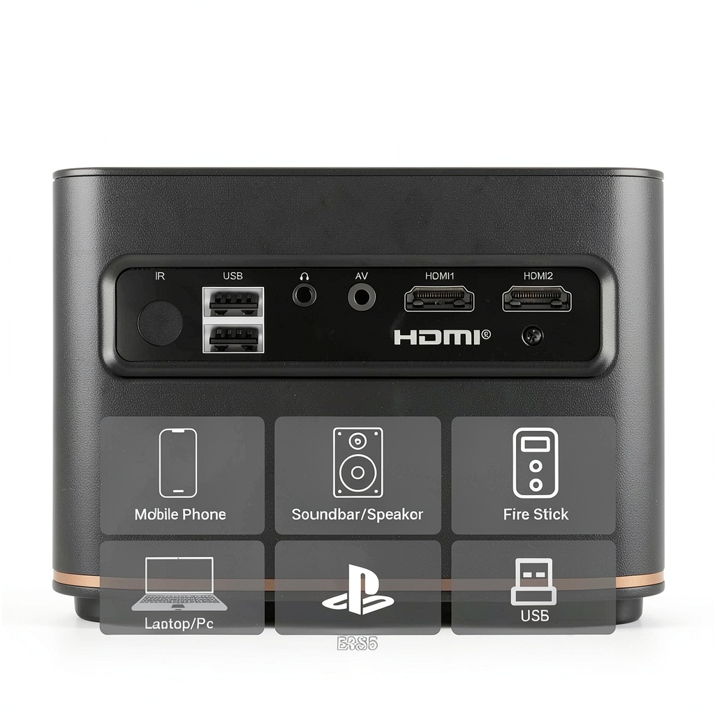 It supports HDMI, USB, AV, and wireless connections, compatible with TV sticks, Chromecast, Roku, phones, PCs, laptops, and gaming consoles like PS4 and PS5.