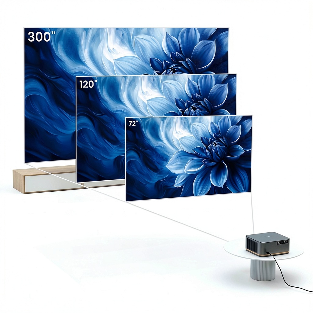 The projector can display up to 300 inches diagonally, with a zoom function to adjust the size based on your space and preferences.