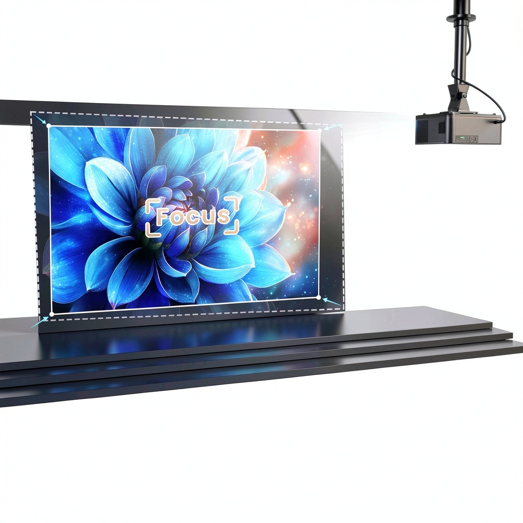 The projector uses AI technology to automatically adjust focus and keystone within seconds of startup, ensuring a sharp, rectangular image without manual intervention.