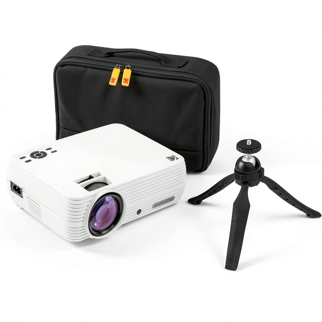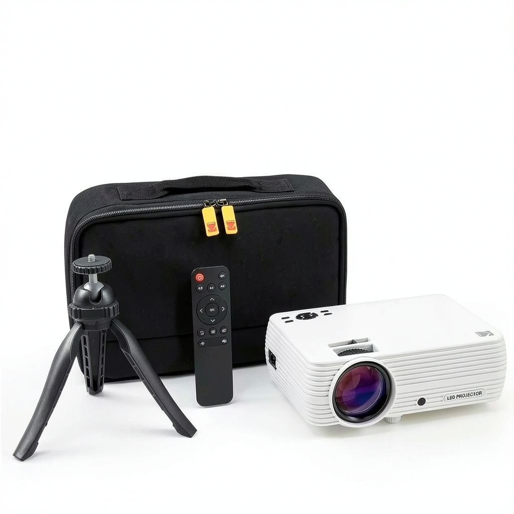 The Kodak FLIK X7 Home Projector is a versatile 720p portable home theater system designed for ease and performance. It features 1080p compatibility and a bright LED lamp that projects clear, vibrant images with crisp details. Constructed with durable materials, this projector includes multiple inputs such as HDMI, USB, VGA, and AV, along with built-in speakers and a 3.5 mm audio port for enhanced audio options. Ideal for home use or travel, it comes with a remote control, tabletop tripod, carrying case, charging cable, and user guide for complete convenience.