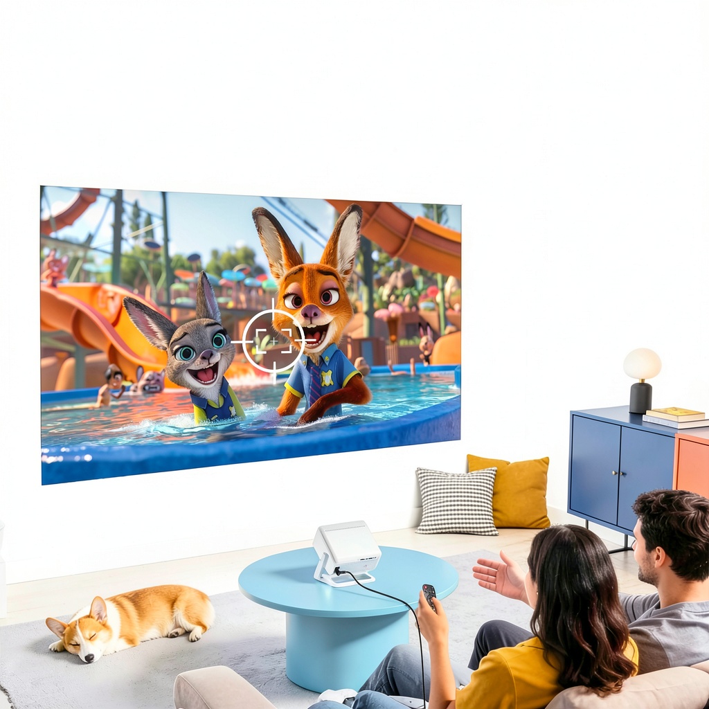 The projector uses high-precision sensors and an AI algorithm to automatically adjust focus, keystone, and alignment within seconds after startup, ensuring a sharp image without manual input.