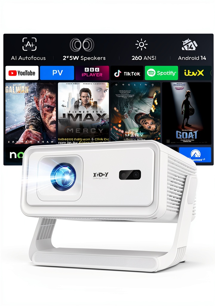 The Xgody A1 Smart Portable Projector combines Android 14 with Wi-Fi 6 and Bluetooth 5.4 for easy access to streaming apps and wireless audio. Its auto focus and 6D keystone correction ensure a clear, aligned image in seconds, perfect for bedrooms, apartments, or on-the-go viewing. Enjoy 720p HDR10 visuals and built-in stereo speakers for an immersive home cinema.