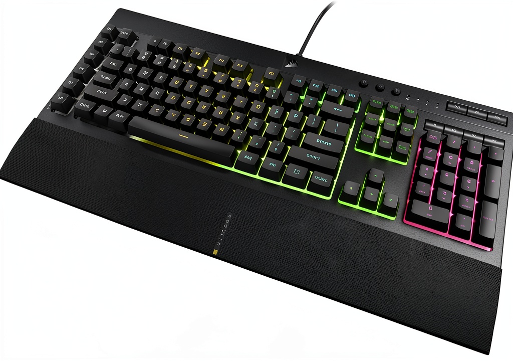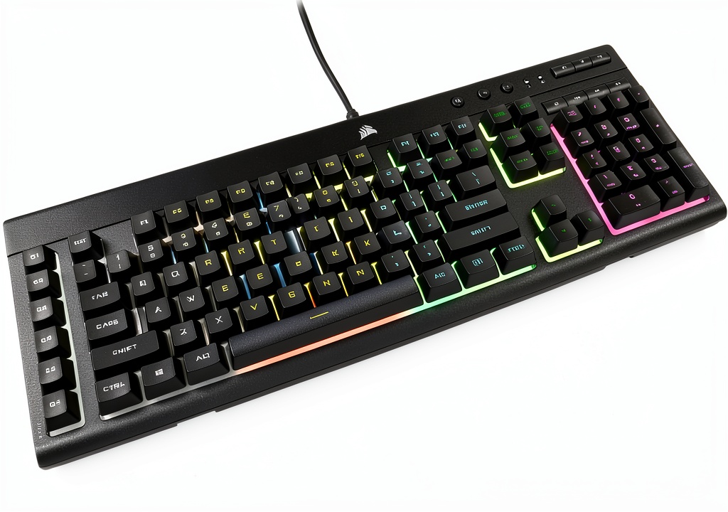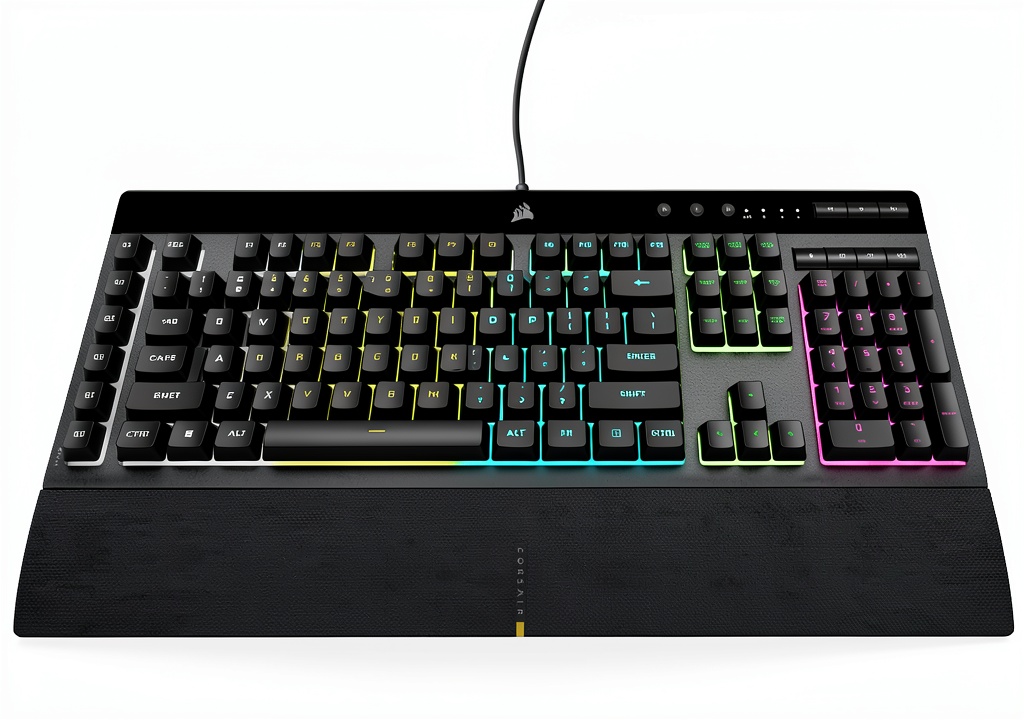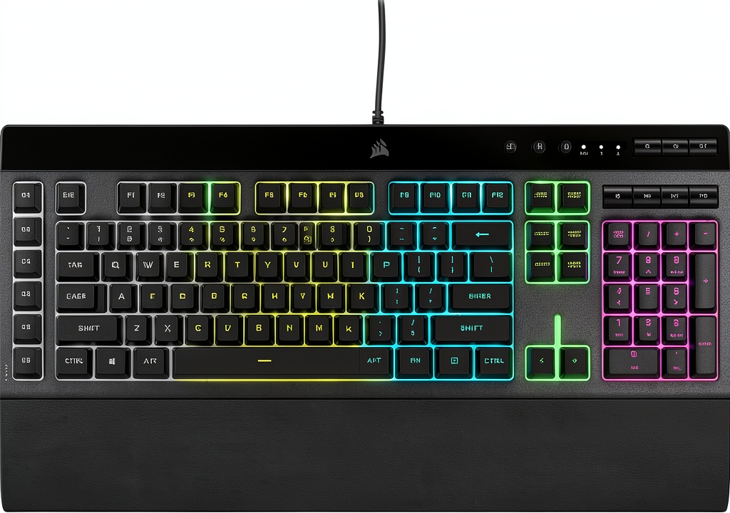 The CORSAIR K55 RGB Pro is a full-size wired gaming keyboard designed for performance and customization. It features dynamic RGB lighting with multiple zones that can be personalized via CORSAIR iCUE software. The keyboard utilizes dome membrane switches for quiet, responsive keystrokes, making it suitable for extended gaming sessions. Integrated Elgato Stream Deck software allows users to control streaming functions directly from the keyboard, enhancing content creation workflows. Constructed with a durable plastic frame and spill-resistant design, it ensures longevity and reliability in various environments.