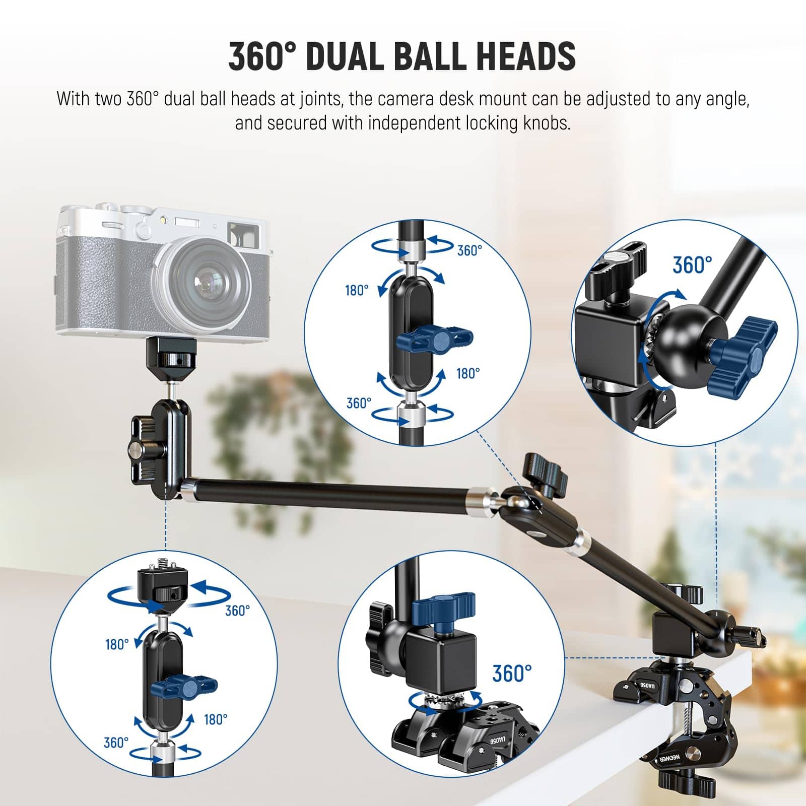 - 360° dual ball heads and 30-inch articulating arm for flexible adjustment and secure locking.