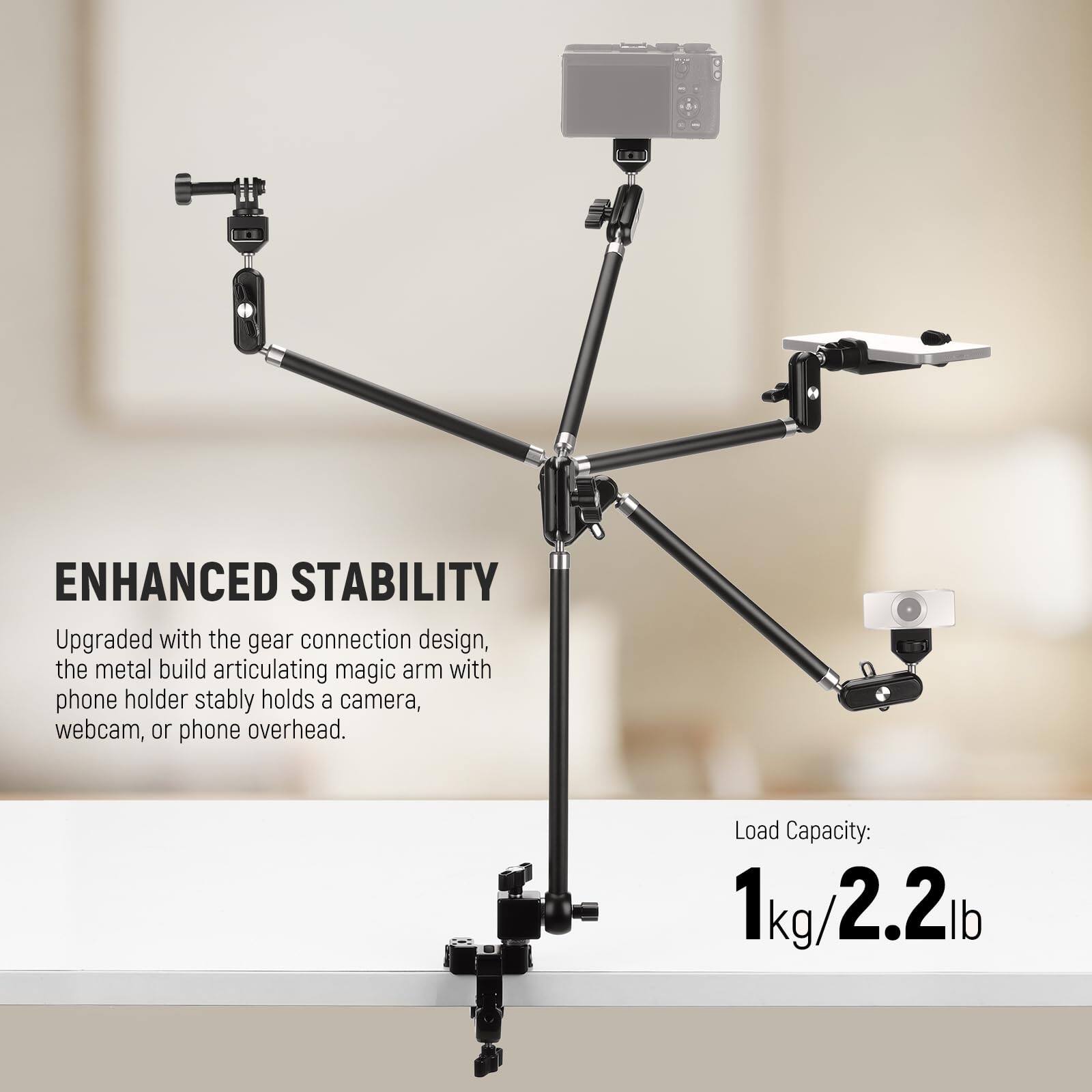 The magic arm can securely hold cameras or phones weighing up to 2.2 lbs, ensuring stable overhead filming without slippage.