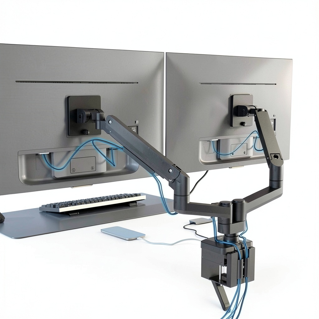 Integrated routing channels hide and organize cables behind the arms, reducing clutter and improving safety.