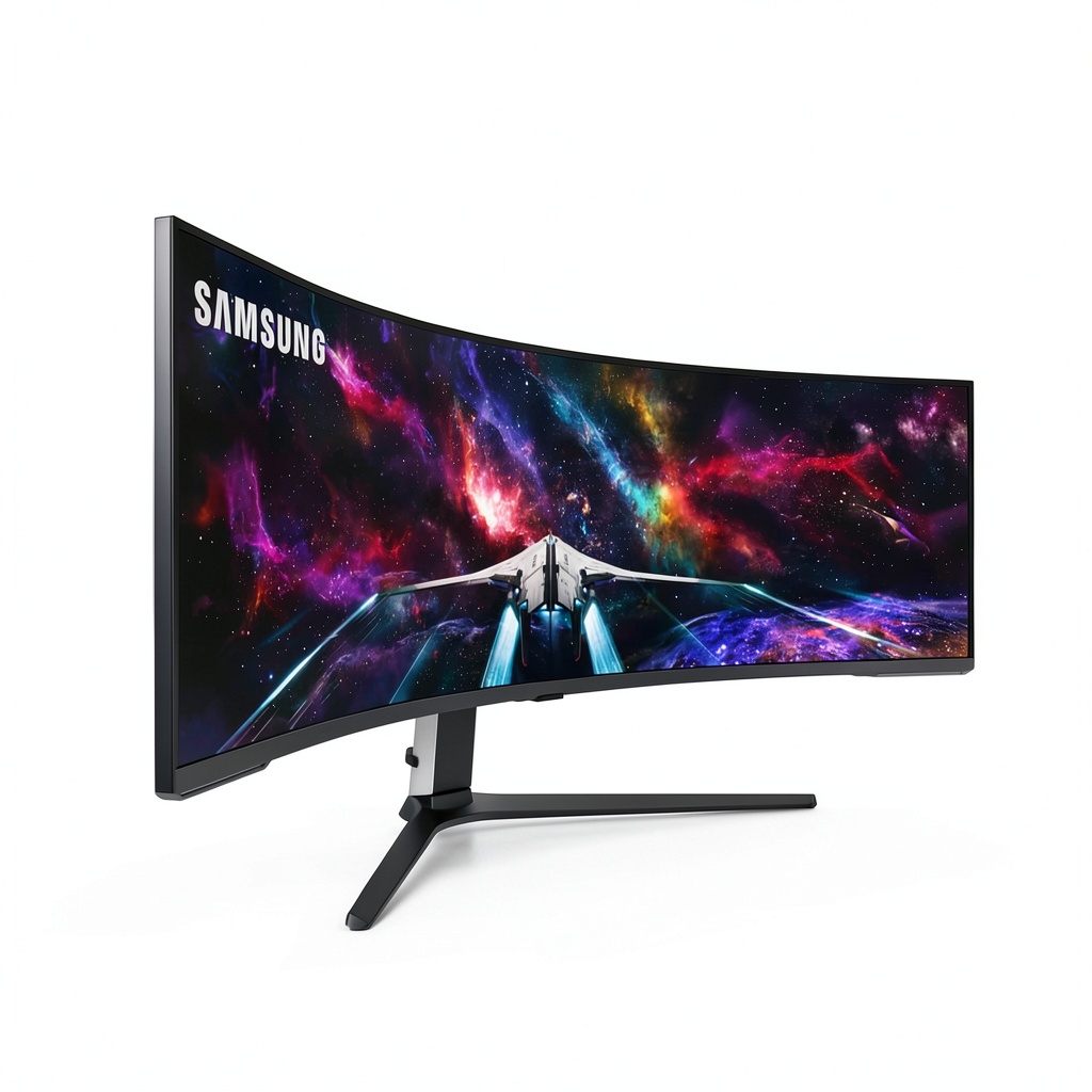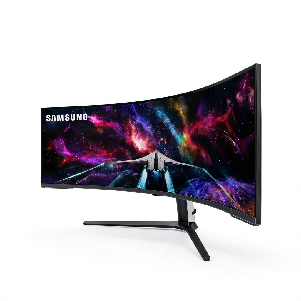 The Samsung 57 Odyssey Neo G9 features a dual UHD resolution, equivalent to two UHD monitors combined, providing sharp and detailed imagery across the wide screen.